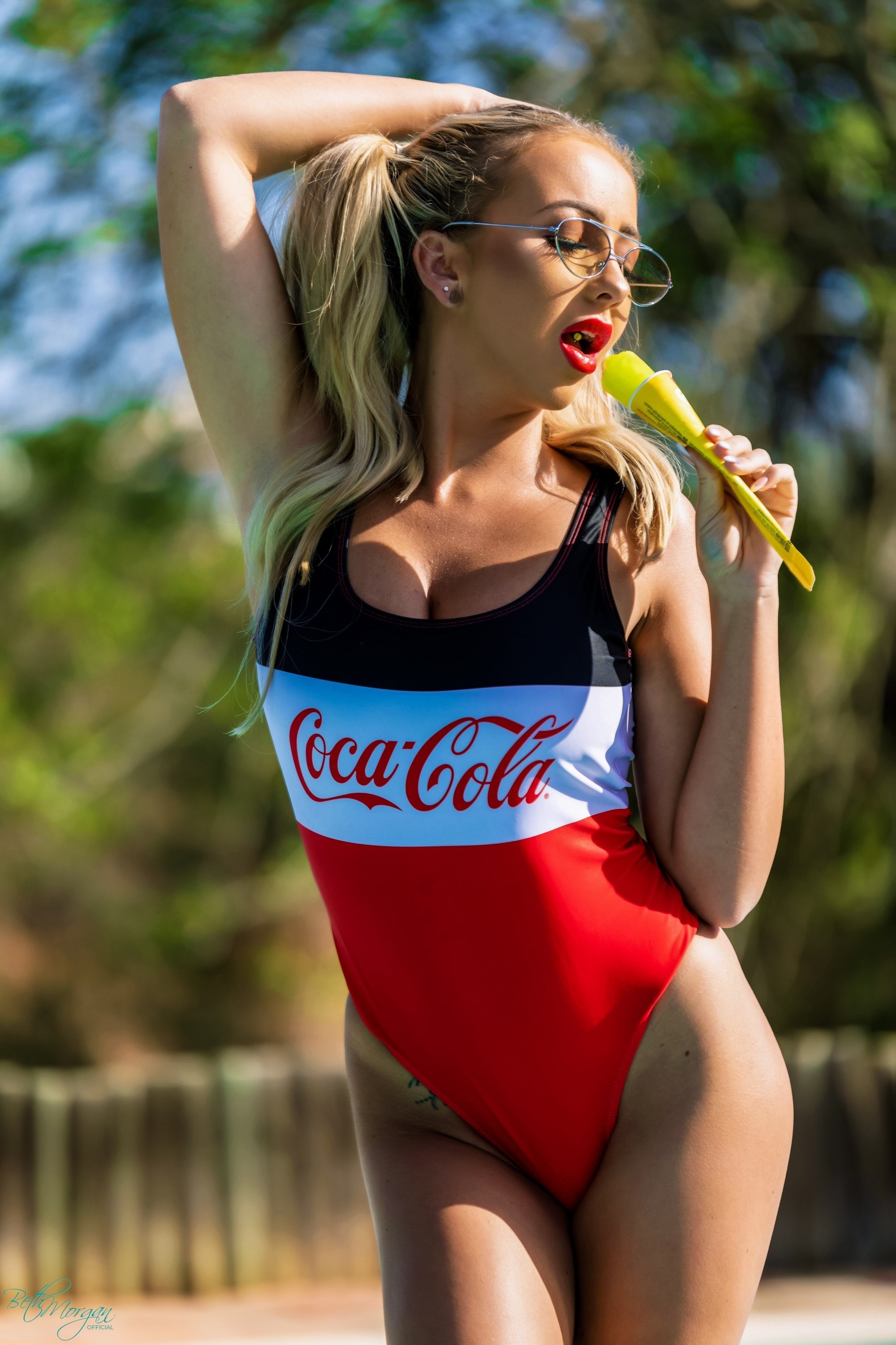 If there is one thing that can make any chick instantly hotter, it’s her naughty personality. The moment any cutie shows that a horny little minx is hiding underneath and waiting for her moment to shine, she turns into a sex bomb. Of course, it helps if the mentioned lady is already breathtaking, like Beth Morgan. This incredibly mischievous blonde is a girl with many talents. From her appearance to that kinky behavior, she’s not someone you want to miss. For this particular photo shoot, the cutie went with a tight and playful combination. The photographer met her next to a nearby pool, so it was only natural for Beth to wear a one-piece swimsuit. No matter how covering that swimsuit was, it couldn’t hide the fact that this lady was stunning. Her long, slender legs were glistening in the sun as those luscious lips with stark red lipstick slobbered on a popsicle. And even though the clothing covered the majority of her chest, you could already tell she packed a pair of big melons below. Having finished her refreshment, the blonde focused on the teasing aspect of her performance. With her hair in pigtails, she was both cute and sexy at the same time. After sitting down and standing back up to give us a good look at her figure, this chick finally started stripping. Just like that, she dropped the top of the swimsuit down and pulled those massive jugs out. Two amazing tits were now hanging freely as the girl toyed with them, squeezing, pinching, and bouncing them around. With that out of the way, it was only a matter of time before Beth was completely naked, and she wasn’t known to be patient. With nothing but sunglasses on, she kept having dirty fun by the pool.
